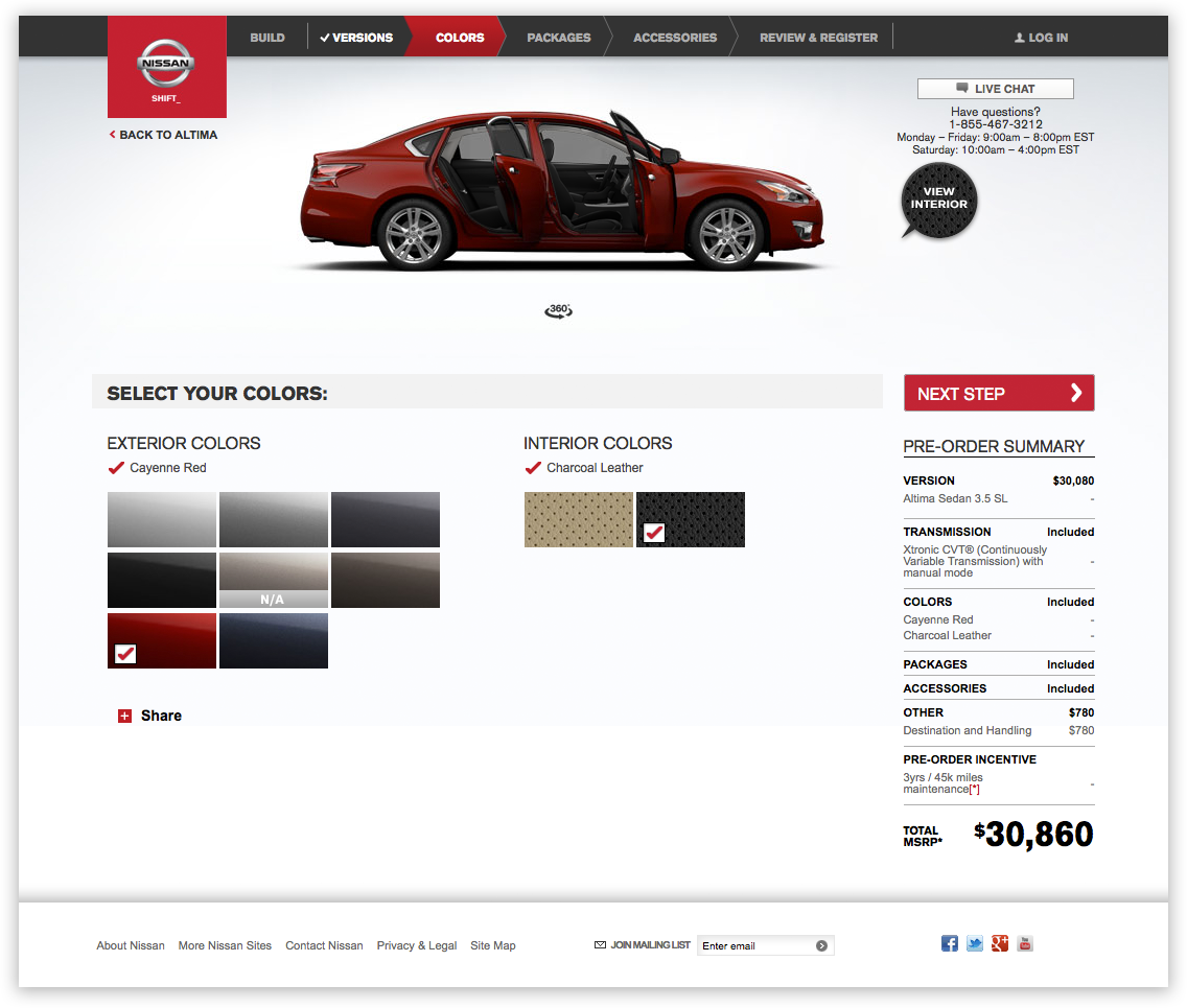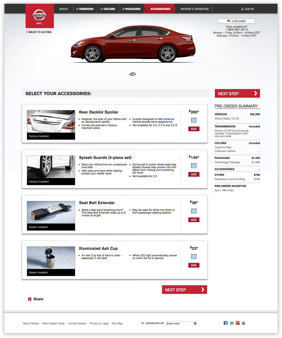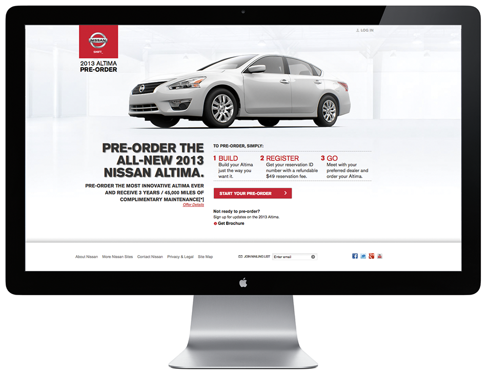 As a designer at Critical Mass, I worked on designing the pre-order build and buy process for the launch of the 2013 Nissan Altima.
