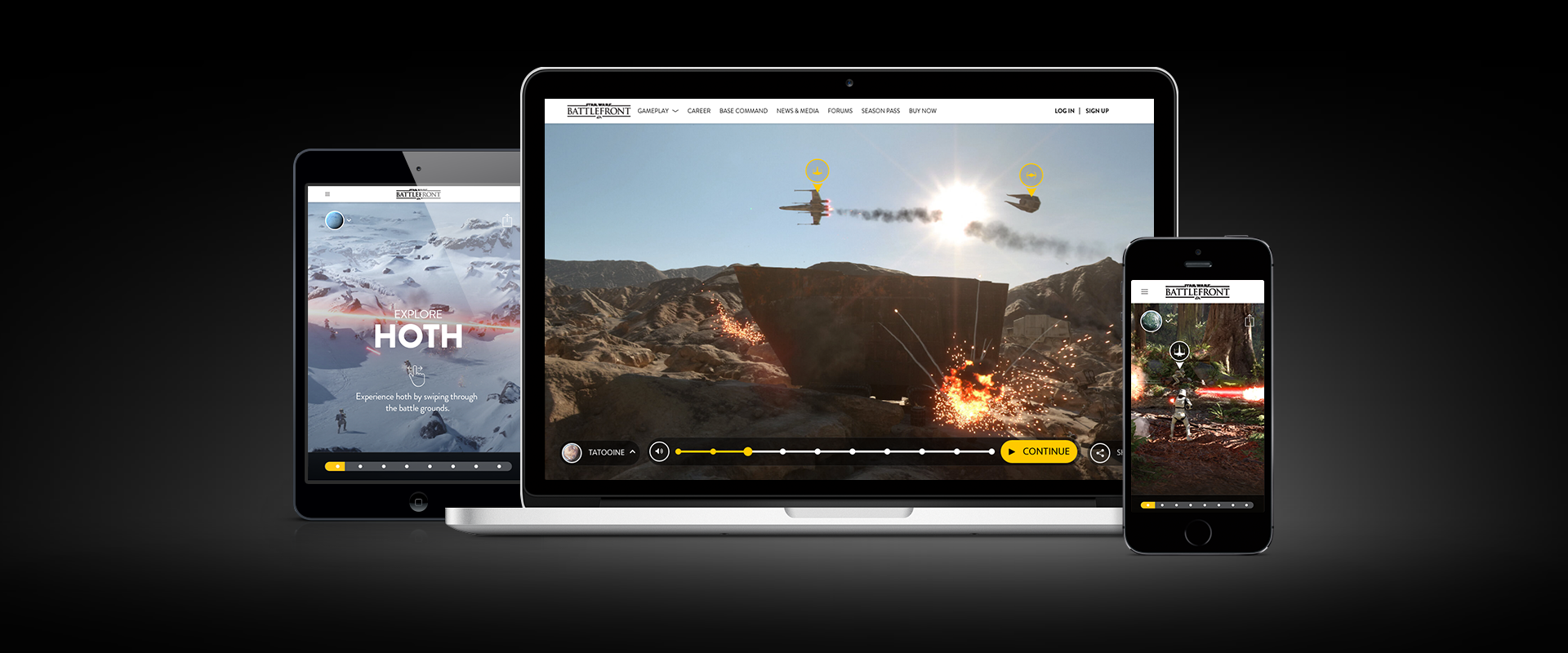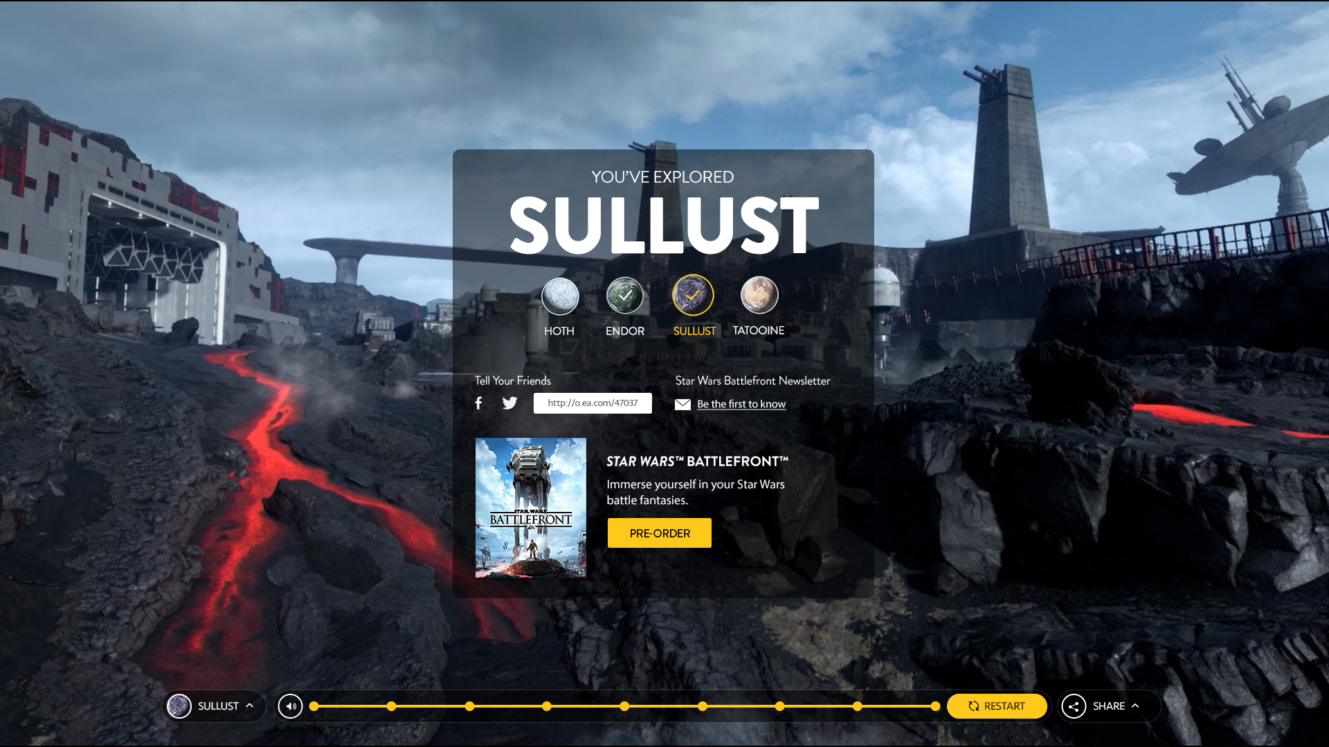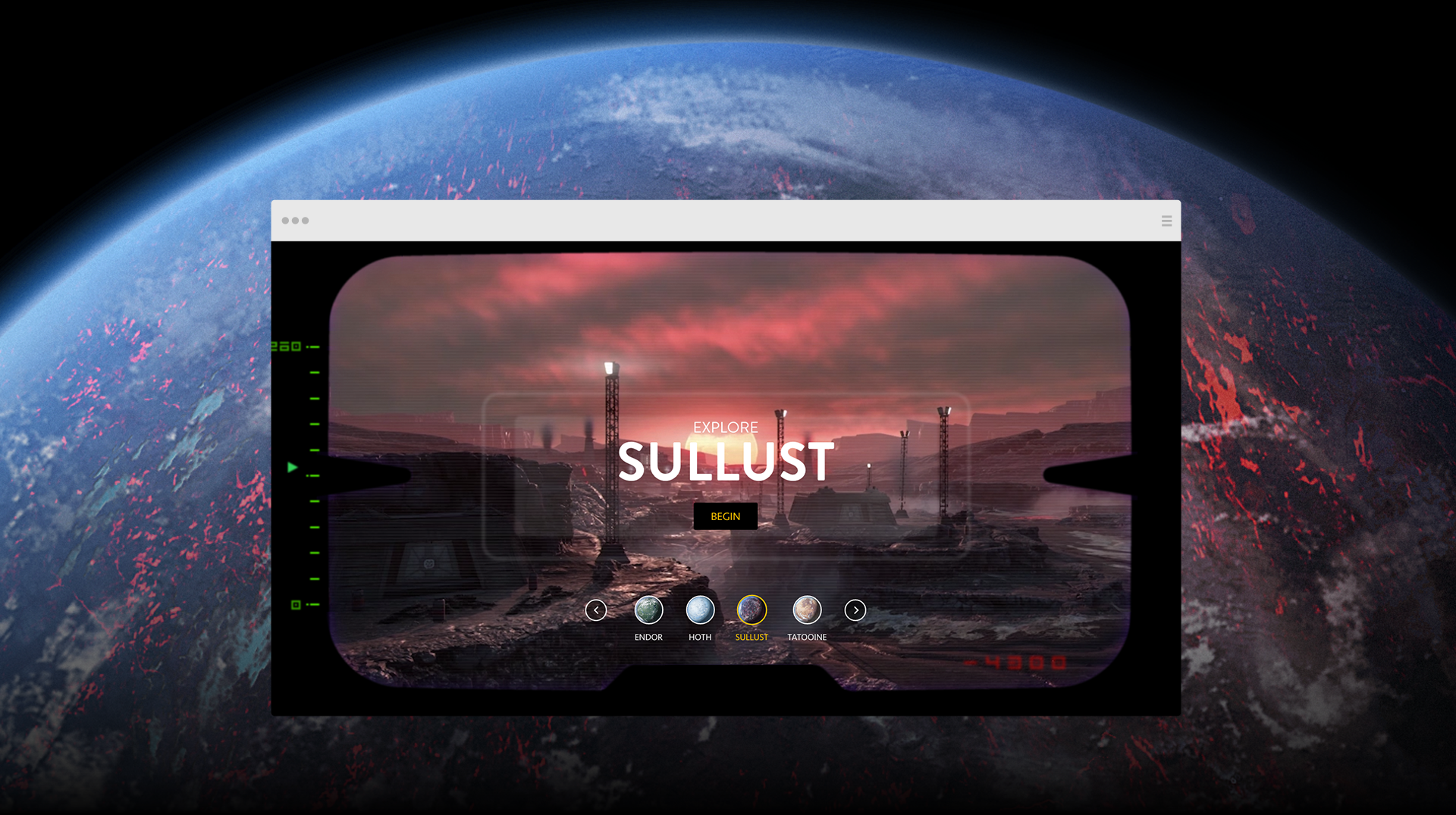 The Star Wars Battlefront Planets Experience was designed to provide fans with a sneak of the game leading up to launch. The execution allowed users to progressively explore planets while engaging with points of interest along the way.